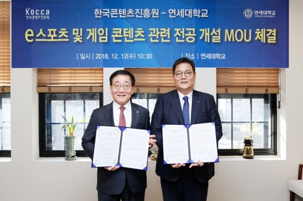 [스마트경제] 한국콘텐츠진흥원(이하 한콘진)은 12일 연세대학교(이하 연세대)와 e스포츠 및 게임 콘텐츠 관련 전공 개설을 추진하기 위한 양해각서를 체결했다.