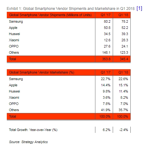 삼성전자를 제외한 2∼4위 업체는 출하량이 늘었다. 점유율 15.1%로 2위인 애플은 5천220만대를 출하해 작년 1분기보다 3% 늘었고, 3위 화웨이도 3천930만대를 출하해 14% 증가했다. 4위를 차지한 샤오미는 2천830만대를 출하해 점유율을 작년 1분기 3.6%의 2배인 8.2%로 높였다.
