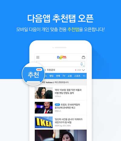 카카오는 지난 10일 오후부터 자사가 운영하는 포털 다음에 모바일 첫 화면에 '추천' 탭을 신설했다. 추천 탭은 뉴스보다 왼쪽, 즉 첫 번째에 있다. 이전까지 첫 번째 탭이었던 '뉴스' 탭은 오른쪽으로 한 칸 밀렸다.