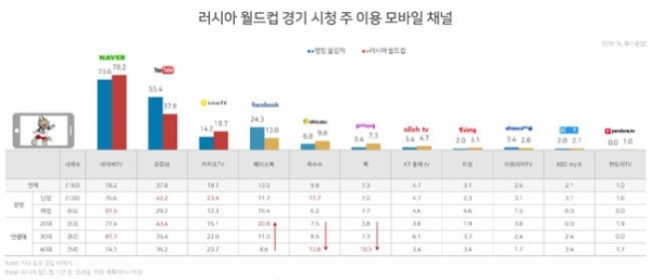 국내 인터넷이용자들은 월드컵 시청 주요매체로 TV가 아닌 모바일을 꼽았다. 모바일 채널 중에서는 유튜브가 아닌 네이버TV가 압도적으로 많았다. 가장 관심있는 한국의 경기는 독일전이었다.