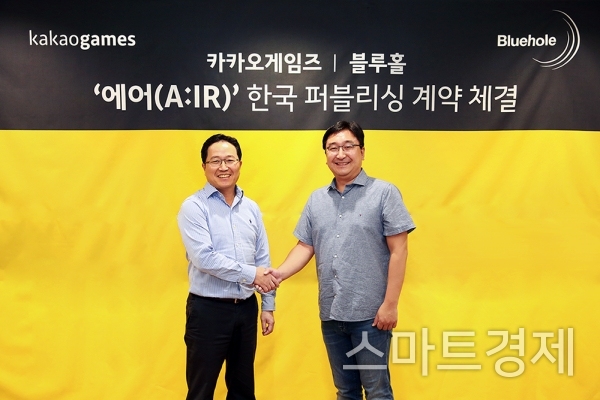 [스마트경제] 카카오게임즈는 12일 블루홀이 개발 중인 블록버스터 MMORPG '에어(A:IR - Ascent: Infinite Realm)'의 한국 퍼블리싱 계약을 체결했다고 밝혔다.