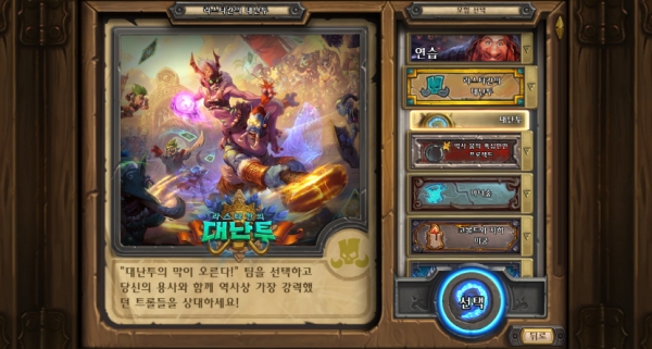 [스마트경제] 블리자드 엔터테인먼트는 하스스톤(Hearthstone®)의 신규 확장팩, ‘라스타칸의 대난투(Rastakhan’s Rumble™)’의 주요 컨텐츠인 1인 모험 ‘대난투(Rumble Run)’를 14일부터 선보인다. 대난투를 통해 플레이어들은 트롤 검투사 리카르가 되어 상대 팀의 용사들을 물리쳐 구루바시 투기장의 최강자가 되어야 한다.