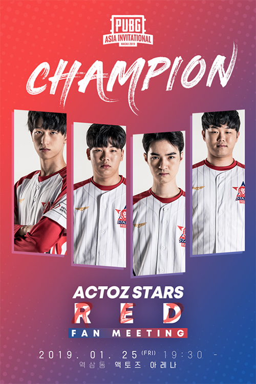 지난 10일부터 12일까지 사흘간 치러진 'PUBG ASIA INVITIATIONAL(PAI) 2019 MACAO' 최종 우승을 기념해 준비된 이번 팬미팅은 오는 25일 오후 7시30분 서울시 역삼동에 위치한 액토즈 아레나에서 열린다.
